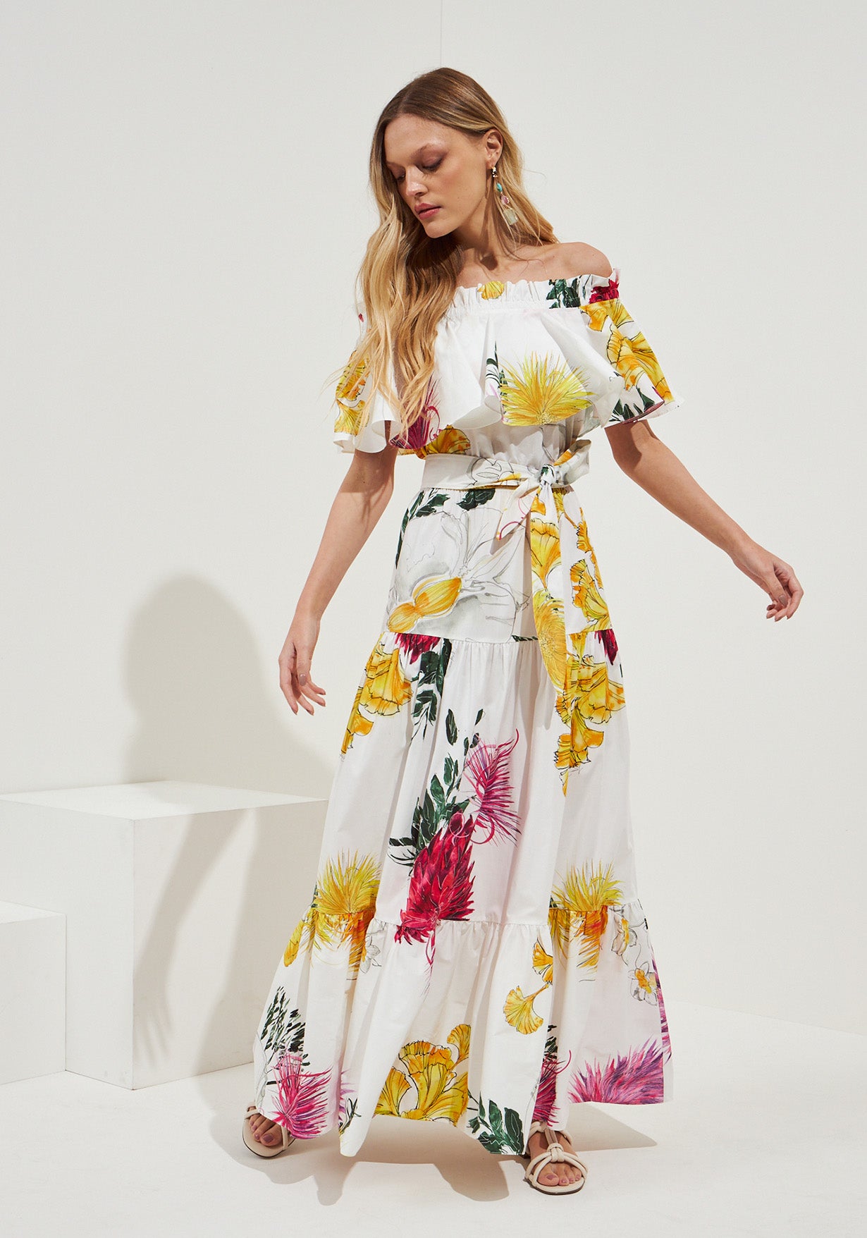 Beautiful off shoulder dress , exclusive floral print and matching belt .