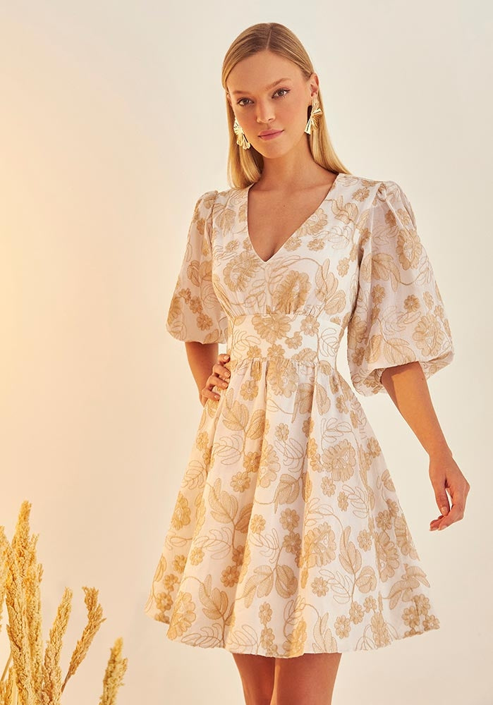 Beautiful embroidered dress with puffed sleeves and evaze skirt style.