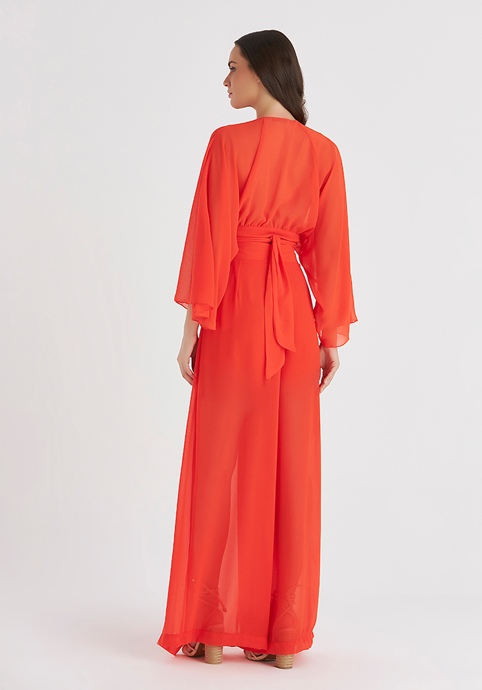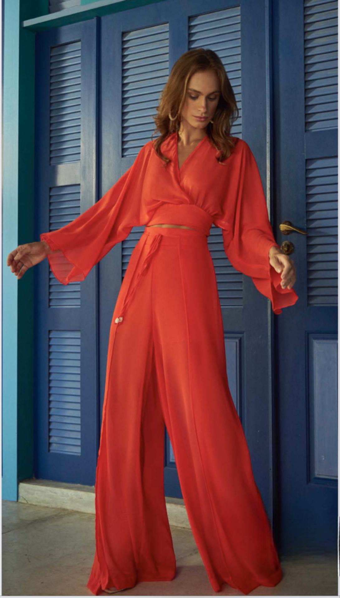 Set with a light fabric, vibrant color, pants with side slit and cropped top with long sleeve.